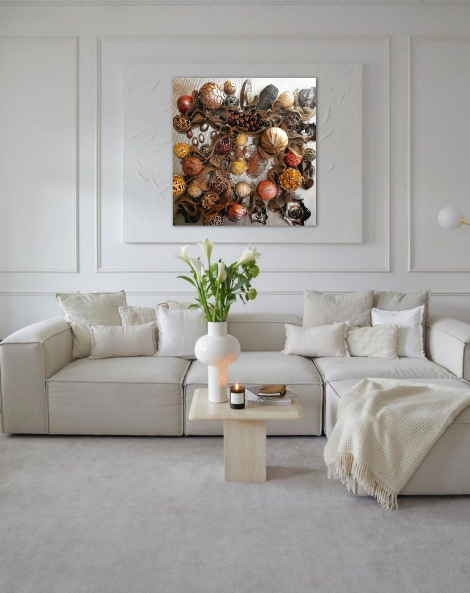 La juta intrecciata aggiunge una dimensione tattile e terrestre, rappresentando le radici e i legami che ci ancorano alla terra. È un richiamo alla tessitura della vita, fatta di connessioni profonde e intrecci invisibili che ci uniscono al cosmo.