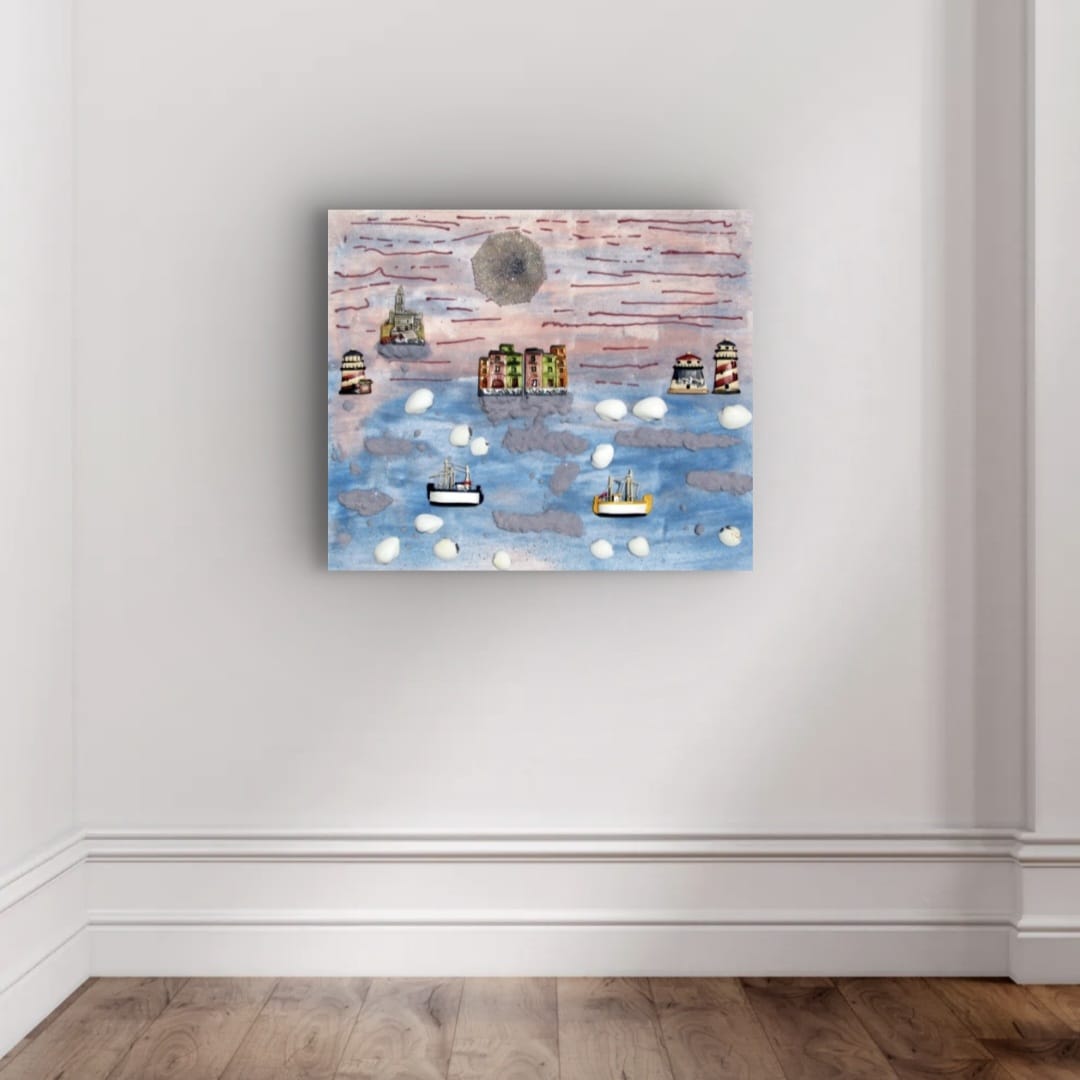 Among the waves, I inserted small boats and turrets, symbols of marine life and the traditions of Portovenere. The typical colorful houses of the place add liveliness and character to the scene, evoking the joy and history of these villages.
